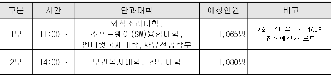 커뮤니티 공지사항 학과뉴스 포토갤러리 우리들의 UCC 추천사이트 취업(정보/게시판/공고) 해외(연수/해외인턴십) 재학생 Q&A 공지사항Home커뮤니티공지사항 <2026학년도 입학식 계획 안내> 작성자 : 학과관리자 | 작성일 : 2026.02.19 | 조회수 : 253 가. 대상: 2026학년도 신입학 및 편입학생 전체 나. 기간: 2026.2.27.(금) 11:00_1부, 14:00_2부 (장소: 우송예술회관) 다. 진행방법: 단과대학별로 1부, 2부로 나누어 진행 라. 단대별 시간 (간호학과는 보건복지대학에 해당됩니다.) 마. 자세한 입학식 식순 및 학과병 좌석배치도는 첨부파일 참고해주시길 바랍니다. * 문의사항: 간호학과 행정조교 (042-630-9290) 첨부파일 2026학년도 입학식 안내.PNG 1. 2026년 2월 입학식 안내장.hwp 2. 2026학년도 입학식 식순(2026.2.10).hwp 3. 2026학년도 입학식 학과별 좌석배치 학과별 좌석배치도.pdf 목록 이전글 이전 글이 없습니다. 다음글 <우송대학교 2025학년도 전기 학위수여식 안내>